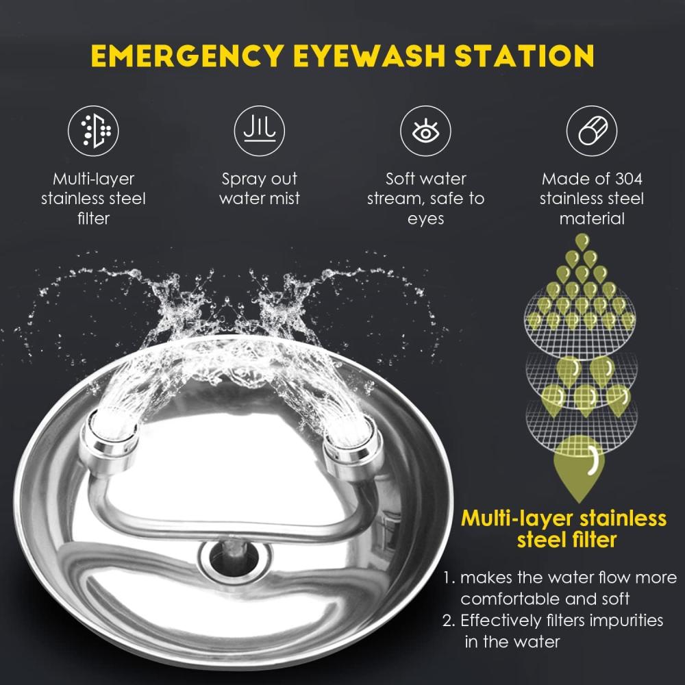 - Twin Spray Heads: Features two spray heads designed to deliver a gentle, aerated, and sufficient flow of water to both eyes simultaneously. Some advanced units use an "inverted directional laminar flow" to sweep contaminants away from the nasal cavity.