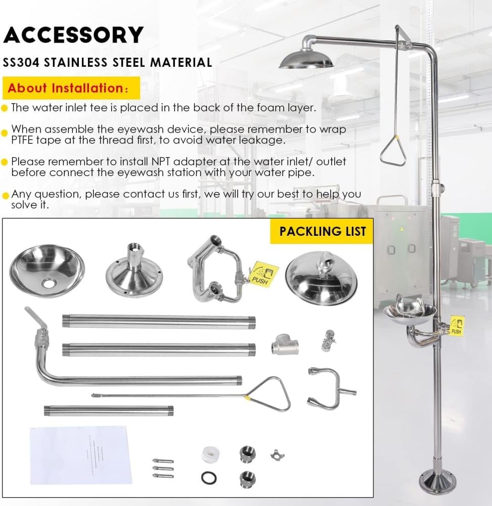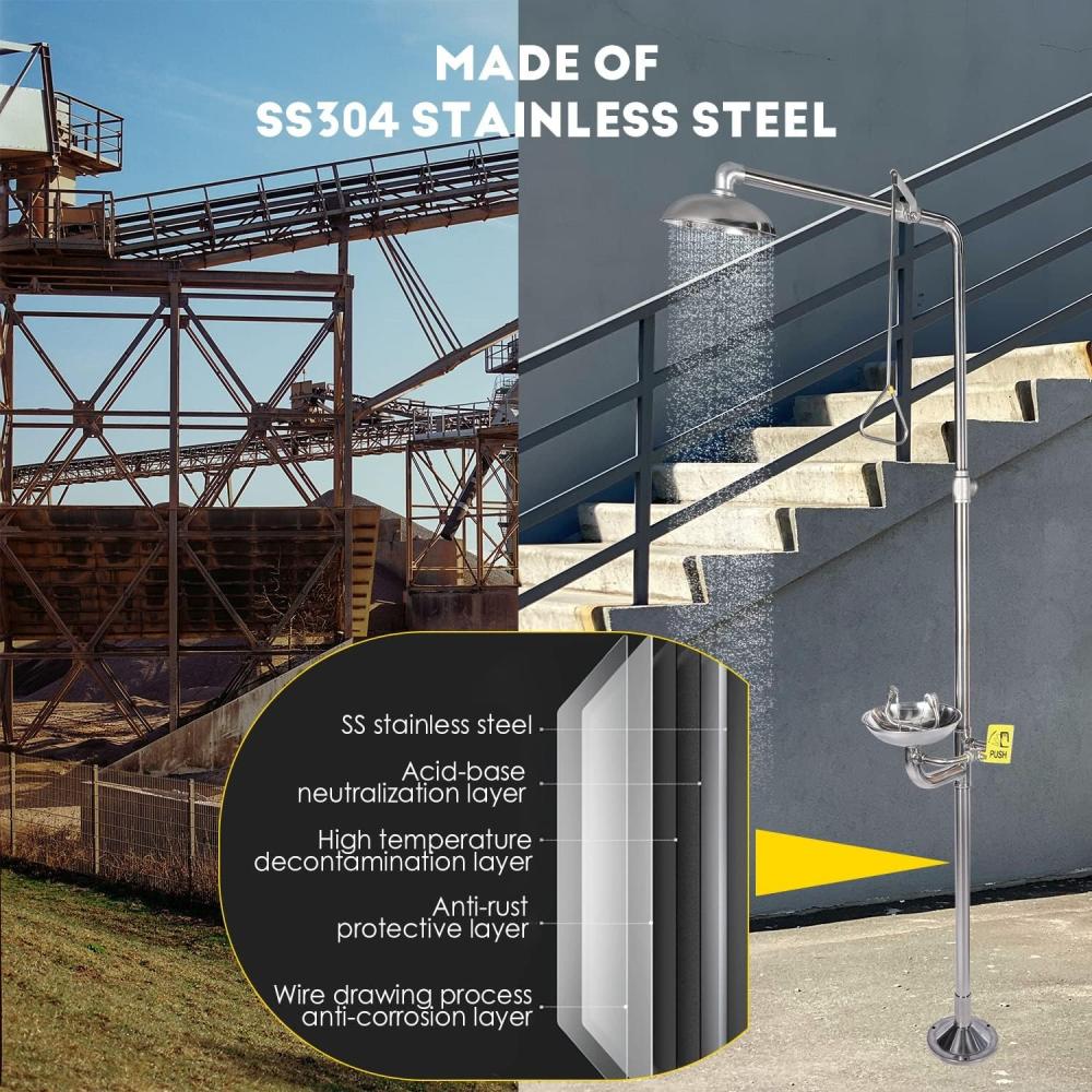 - An Emergency Eyewash Station, Combination Eyewash Station with Shower, and Eye and Face Wash Unit with Safety Shower, made of 304 Stainless Steel, and including an Eyewash Sign is a critical safety device designed to provide immediate decontamination in environments where individuals may be exposed to hazardous or corrosive materials.